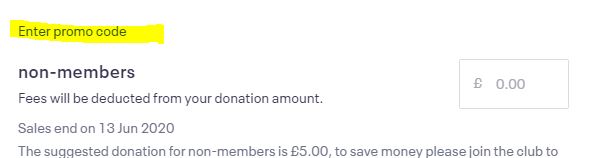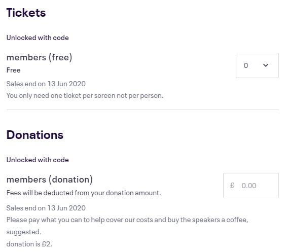 You should now see the members ticket options. You may make a donation to help with our costs and buy the speakers a coffee if you wish.