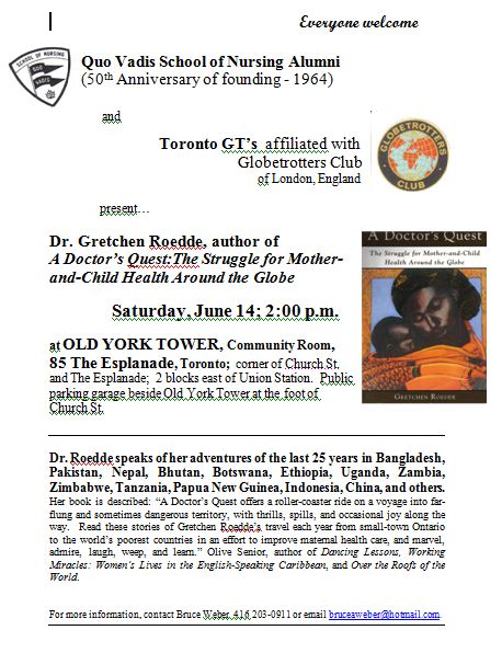 Dr. Gretchen Roedde speaks on her work for the past 25 years in Bangladesh, Pakistan, Ghana, Botswana, Papua New Guinea, and elsewhere, training healthcare workers, midwives, and assessing programs in aid of Mother and Child Health.