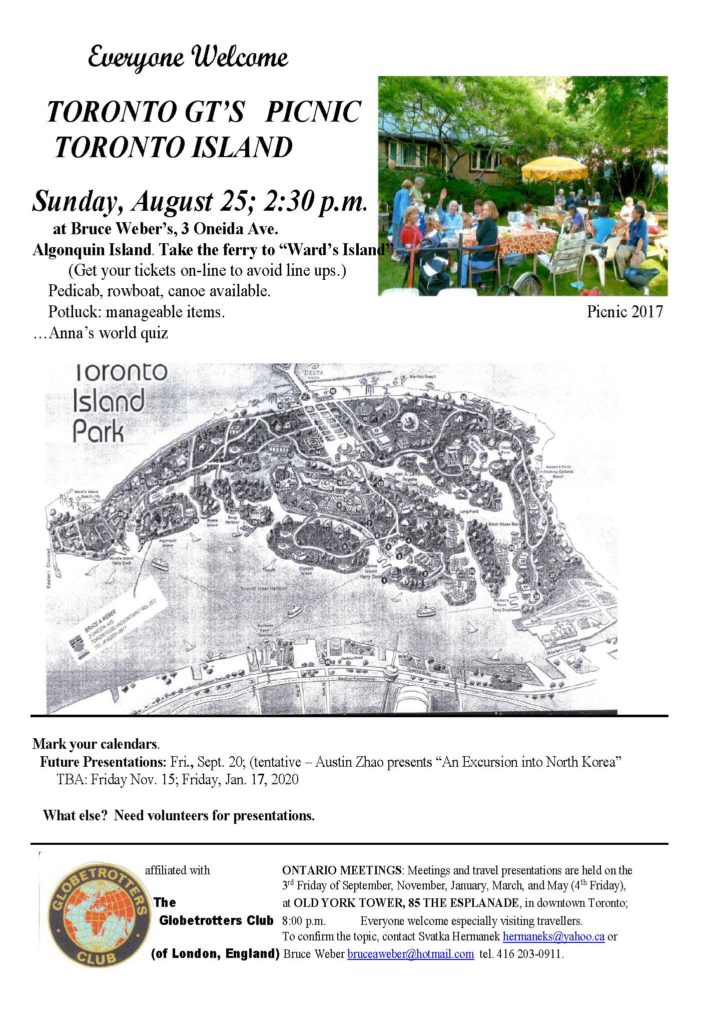 For information on Ontario meetings, please contact Svatka: hermaneks@yahoo.ca or Bruce: at bruceaweber@hotmail.com. Meetings and travel presentations are held on the 3rd Friday in January, March, May (4th Friday), September and November at 8.00 p.m. at Old York Tower, 85 The Esplanade ( corner of the Esplanade & Church St.) – two blocks east of the Union station. A public parking garage is at the foot of Church Street right next to the Old York Tower.