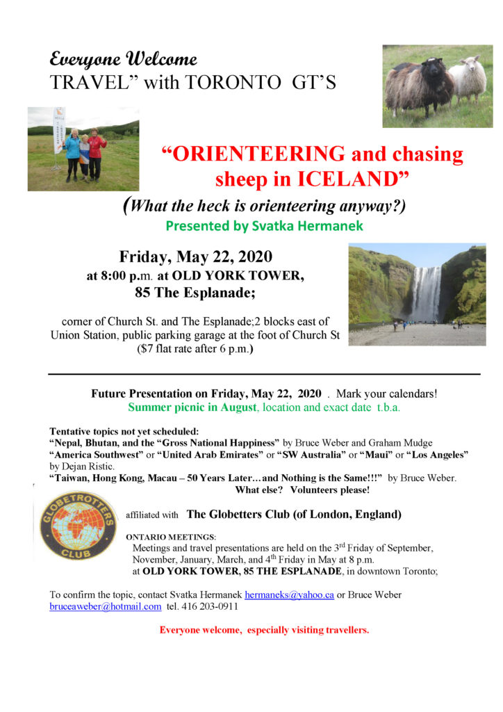 For information on Ontario meetings, please contact Svatka: hermaneks@yahoo.ca or Bruce: at bruceaweber@hotmail.com. Meetings and travel presentations are held on the 3rd Friday in January, March, May (4th Friday), September and November at 8.00 p.m. at Old York Tower, 85 The Esplanade ( corner of the Esplanade & Church St.) – two blocks east of the Union station. A public parking garage is at the foot of Church Street right next to the Old York Tower.