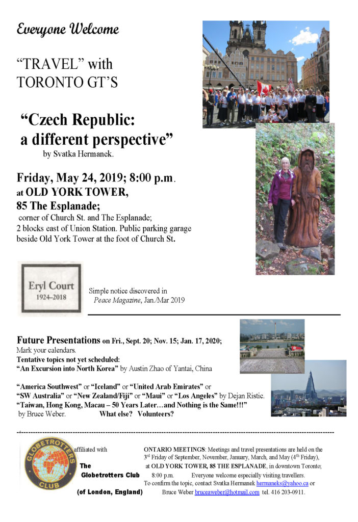 For information on Ontario meetings, please contact Svatka: hermaneks@yahoo.ca or Bruce: at bruceaweber@hotmail.com. Meetings and travel presentations are held on the 3rd Friday in January, March, May (4th Friday), September and November at 8.00 p.m. at Old York Tower, 85 The Esplanade ( corner of the Esplanade & Church St.) – two blocks east of the Union station. A public parking garage is at the foot of Church Street right next to the Old York Tower.