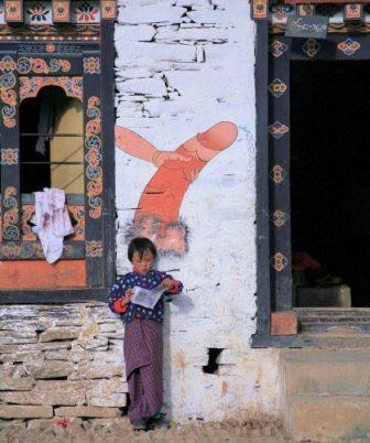 The afternoon saw us climbing another pass to get to Phobjikha Valley, the winter home of the black crane, a very rare bird. We stopped at Nobding, a small village. The reaction of the children indicated few foreigners passed through, surprising considering the murals painted to enhance fertility that were liberally painted on walls and doorways. It was obvious where the knob was in Nobding! Rather than describe them, a photograph will suffice.