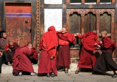 The next morning we visited nearby Tamshing Monastery. A run of the mill old Bhutanese monastery. Outside by the courtyard a group of boy monks were chanting their prayers, some rather reluctantly I thought. A bell rung, the boys jumped up and started to play in the courtyard, fighting and generally mucking around. Somehow this looks a little incongruous when the participants are wearing monks habits.